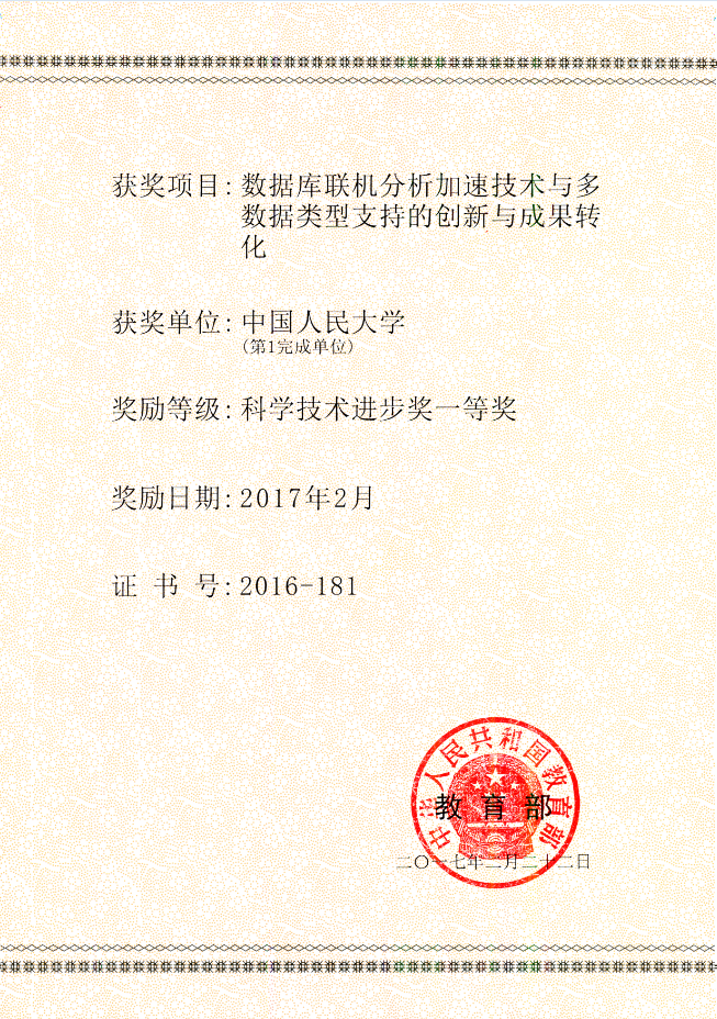 近日,教育部科技发展中心正式公布了2016年度高等学校科学研究优秀成果奖(科学技术)的授奖项目,beat365体育官方网站杜小勇、陈红、张孝、张延松、李翠平、陆嘉恒、王珊申报的《数据库联机分析加速技术与多数据类型支持的创新与成果转化》项目,获评教育部2016年科技进步一等奖。
