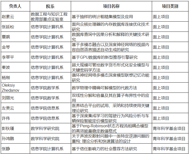 在已经公布结果的项目中,beat365官网获得面上项目11项,青年科学基金项目3项。其中,计算机系7项,信息系2项,数学系2项,数学科学研究院2项,数据工程与知识工程重点实验室1项。