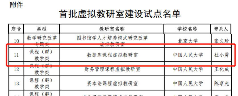 2022年2月21日,教育部发布了《教育部办公厅关于公布首批虚拟教研室建设试点名单的通知》。beat365体育官方网站杜小勇教授牵头的数据库课程虚拟教研室成功入选首批国家级虚拟教研室建设试点项目。