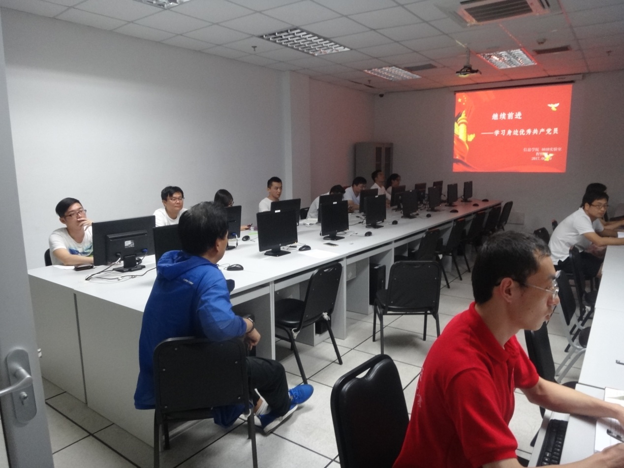 本次党课由梁循教授主持,梁老师首先邀请果玉明老师讲话,果老师从自身经历出发,谈了作为一名合格党员,在任何时候都要以人民的利益,党的利益为重,这是一个共产党员最基本的素养。之后,由程恒超同学开始进入主题。承接上一节课“不忘初心”的主题,程恒超同学先由习总书记的“七一讲话”引出本节课的“继续前进”的主旨,然后从“一辈子做好事”的吴玉章老校长讲起,分四个部分介绍了“身边优秀的共产党员”。最后,歌曲《不忘初心》奏响,本节党课进入尾声。在歌曲声中,实验室圆满完成了这次党课学习。