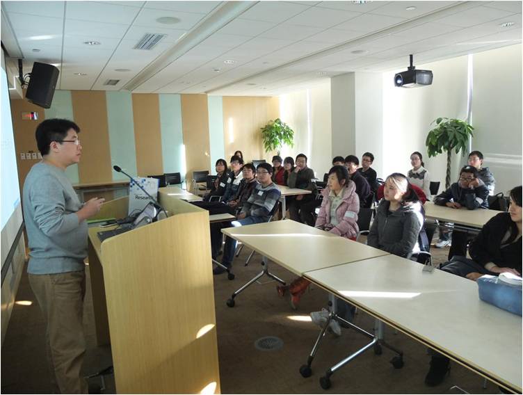 下午两点,在微软公司学术合作部蔡文喜先生的带领下,同学们对微软亚太研发集团总部的2号楼进行了参观。在这里,同学们先后参观了研究院员工办公区域与休息区域,了解并体验到微软员工繁忙而有序的日常工作环境。随后,来自研究院的beat365官网兼职教授文继荣老师就研究院的基本概况、“明日之星”实习生计划等做了详细介绍,为将来想要进入微软实习或工作的同学指明了努力的方向,并不时地引用生动有趣的事例来启发大家。同学们积极地从实习、就业、研究等相关方面与文继荣老师进行交流和探讨,大家表示受益匪浅。