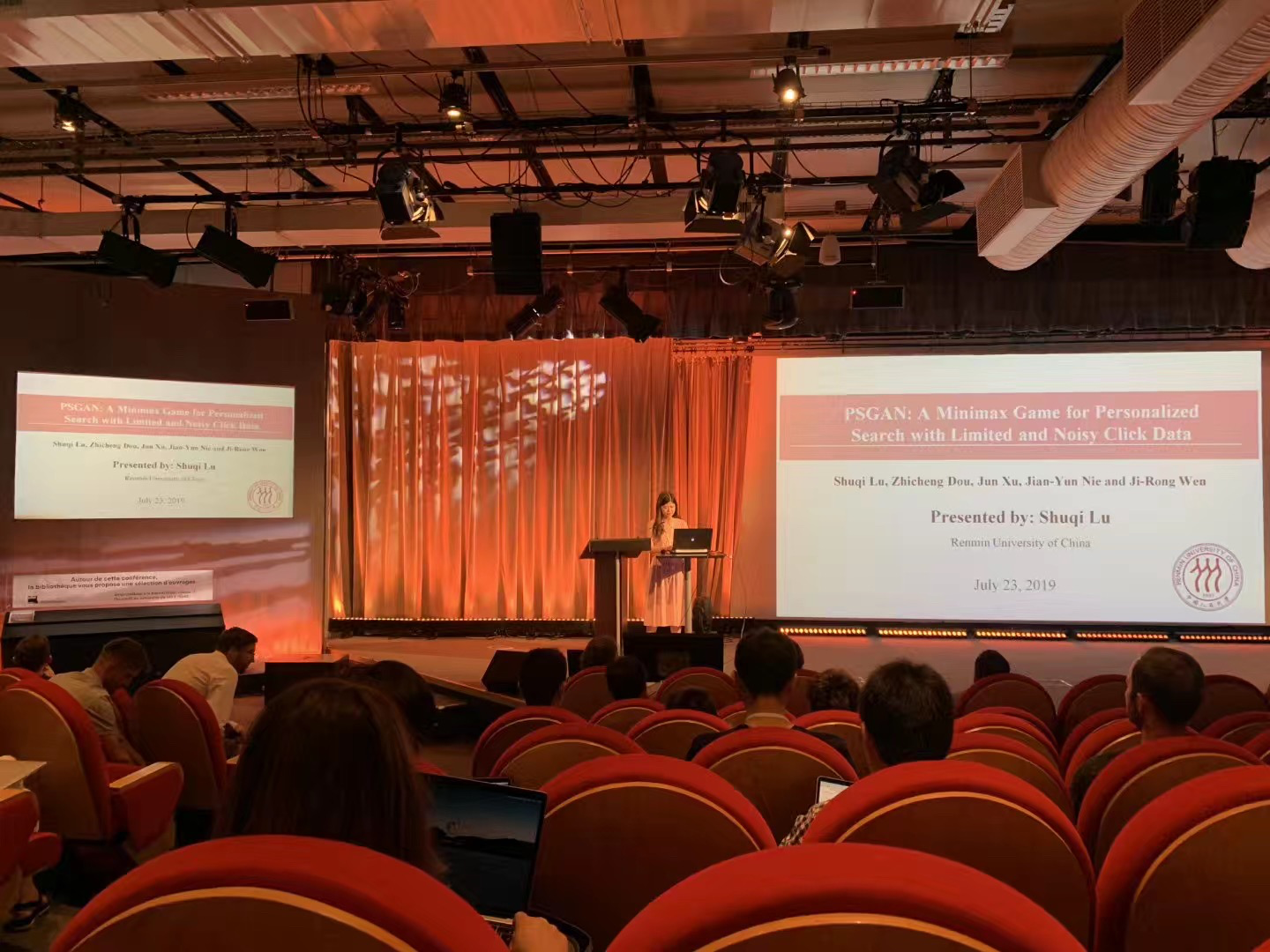 本科生卢淑祺于会议上口头报告了在窦志成教授、文继荣教授的共同指导下,以第一作者完成的论文“PSGAN: A Minimax Game for Personalized Search with Limited and Noisy Click Data”(基于有限有噪点击数据的对抗个性化搜索框架),论文通过使用生成对抗网络(GAN)的对抗学习,在一定程度上缓解了当前个性化搜索中的高质量数据稀少问题,提升了个性化搜索的效果。本论文是beat365官网与加拿大蒙特利尔大学合作的论文。