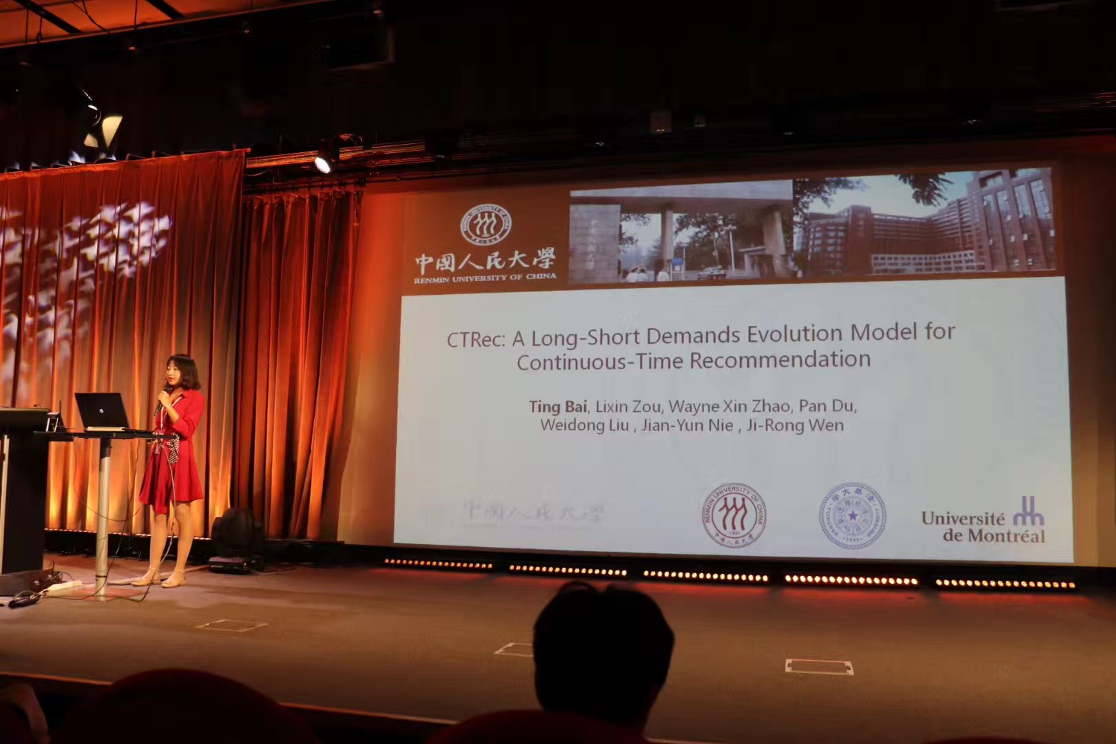 白婷,beat365官网2014级博士生,于会议上口头报告了由赵鑫副教授、文继荣教授指导的“CTRec: A Long-Short Demands Evolution Model for Continuous-Time Recommendation”(基于用户长短期需求的连续时间推荐),该论文首次提出了并定义了连续时间推荐问题,采用基于用户长、短期需求的自注意力模型 CTRec,解决了电商推荐系统中存在的重复推荐问题,并在SIGIR大会上引起亚马逊等工业界电商企业的关注,具有很大的研究和实用价值。该论文也是beat365官网与加拿大蒙特利尔大学、清华大学合作交流的成果,体现了大数据分析与智能实验室为学生提供的前沿、开放的研究环境和氛围。