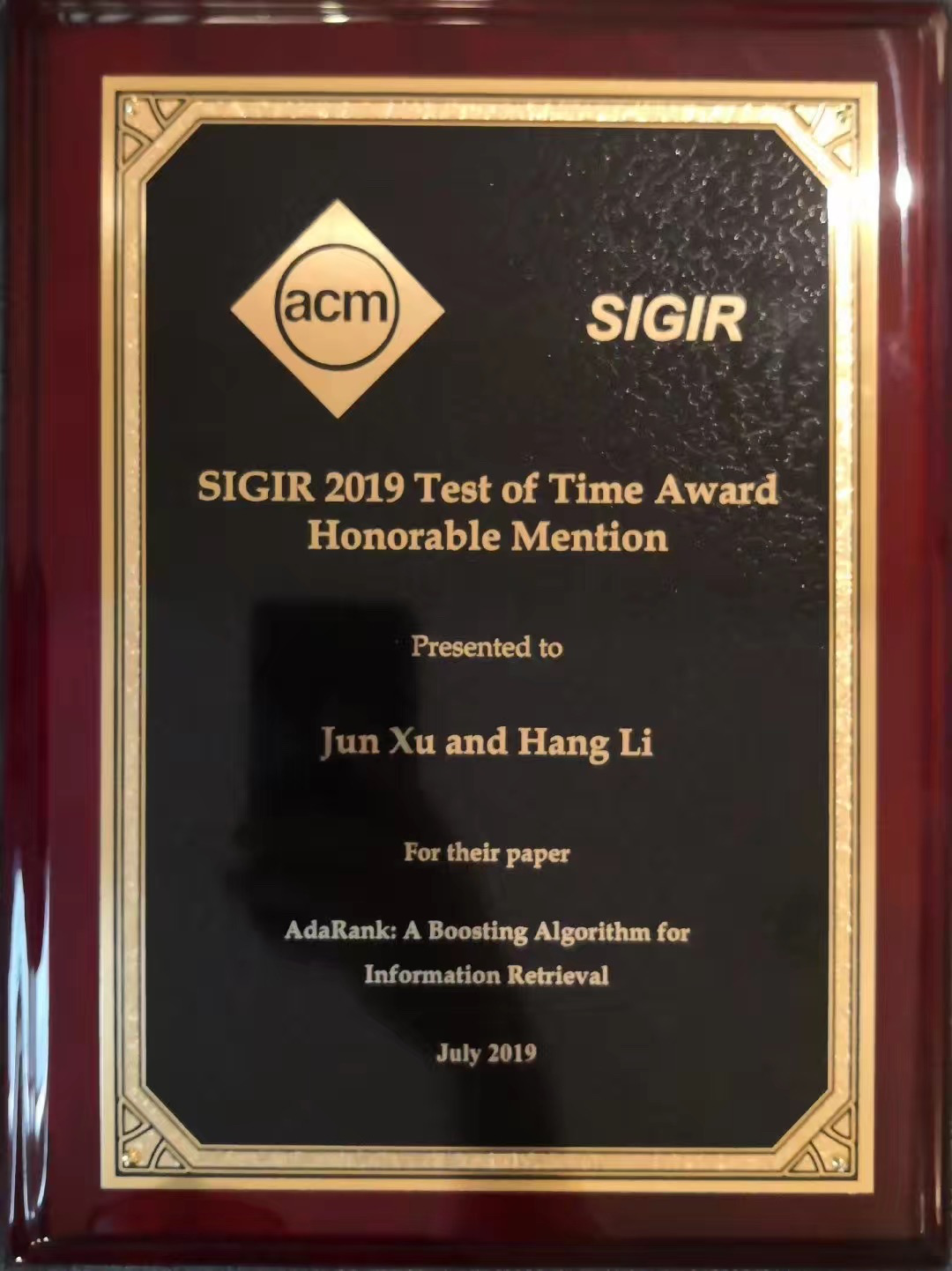 徐君教授被ACM SIGIR授予Test of Time Award Honorable Mention(时间检验提名奖),是该奖项设立以来首次授予来自中国大陆的学者。Test of Time Award是SIGIR学会的最高论文奖,奖励在过去10~12年间对信息检索研究产生重大影响的论文。本次获得提名奖的工作为徐君教授和李航博士发表于2007年SIGIR的论文“AdaRank: A Boosting Algorithm for Information Retrieval”,论文提出了基于Boosting框架的排序算法AdaRank,解决了直接优化非连续、不可导评价准则函数的难题,是该方向的首篇工作,对排序学习的研究发展有着较为深远的影响。迄今为止论文获得了超过700次引用,在多本信息检索教材、专著中引用介绍。