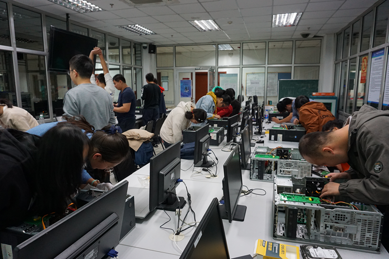 讲解过后,为了让大家更好地理解计算机内部结构,学院提供了十一台主机和全套工具让同学们进行实践操作。在耿亚朋、陈旺、刘永刚老师的指导下,参与的同学依次进行了拆盖、卸机、清理、组装等操作。大多同学由于没有拆装电脑的经验,不知从何下手,但在接受了老师们耐心细致的指导后,同学们开始尝试着手拆机,按照步骤成功将主机拆卸。拆机结束后,指导老师又更深入地讲解了各个配件的作用及修理方法,并列举出了许多在修理过程中应注意的事项。