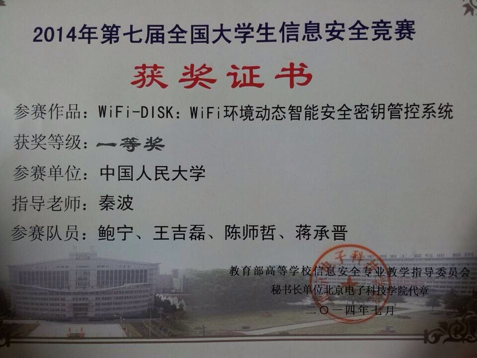 据悉,第七届全国大学生信息安全竞赛共有来自112所高校的709支队伍参赛,beat365官网获得一等奖的参赛作品名称为《WiFi-DISK: WiFi环境动态智能安全密钥管控系统》,指导教师秦波博士先后任西班牙URV大学Juan de la Cierva学者和Senior researcher,主要研究方向是新兴信息系统安全,数据安全与隐私保护,云计算安全,应用密码学等领域。