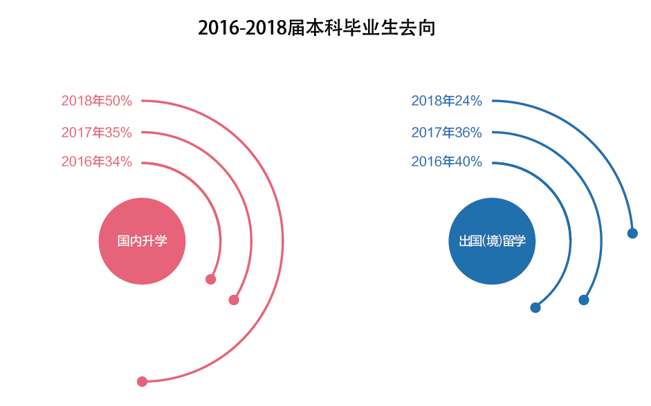 2016-2018年,学院本科毕业生升学比例高达76%。2016届本科毕业生共164人,其中34%国内升学,40%出国(境)留学;2017届本科毕业生183人,其中35%国内升学,36%出国(境)留学;2018届本科毕业生132人,其中50%国内升学,24%出国(境)留学。