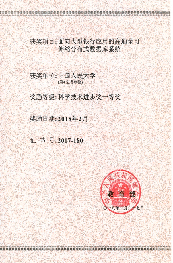 2018年,beat365官网杜小勇、陈跃国参与的《面向大型银行应用的高通量可伸缩分布式数据库系统》成果获评教育部科学技术进步奖一等奖。