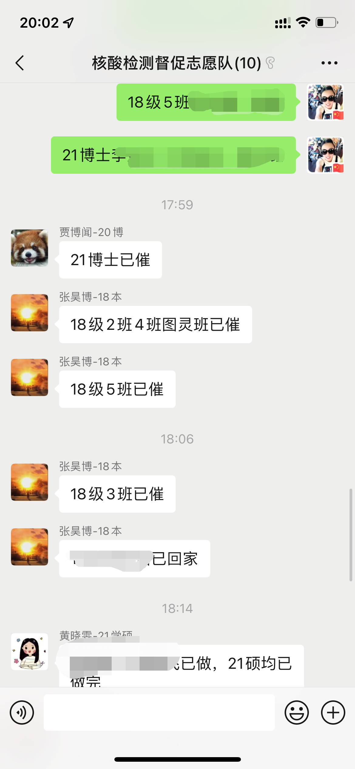 为贯彻落实北京市、学校核酸检测应检尽检的要求,学院组建了云端志愿者队伍,每天及时提醒未进行核酸检测或自我健康监测的同学及时检测并上报,跟踪到底,助力全员检测,努力做到无人漏检。