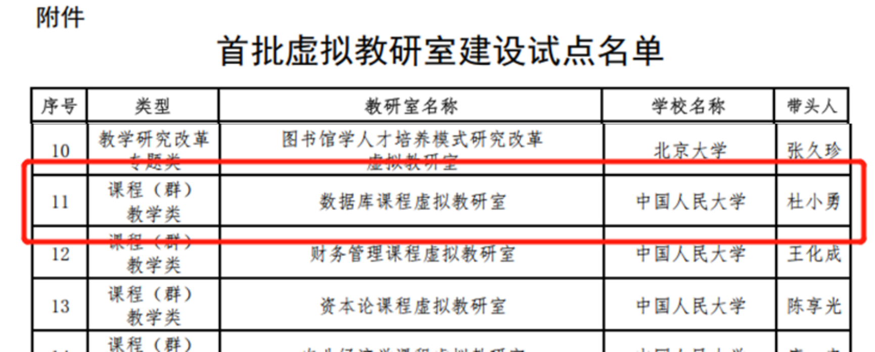2022年2月21日,教育部发布了《教育部办公厅关于公布首批虚拟教研室建设试点名单的通知》。beat365官网杜小勇教授牵头的数据库课程虚拟教研室成功入选首批国家级虚拟教研室建设试点项目。教育部国家级虚拟教研室建设试点项目以立德树人为根本任务,旨在通过开展多元探索,为高等教育高质量发展提供有力支撑。